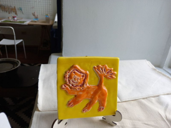 — Ой, може, не треба фотографувати? — знічується господиня майстерні Анастасія Коба, помітивши, що я навела камеру на оранжеве левеня й червоне серце з великими очима — кахлі, виставлені окремо від інших. — Це мої перші роботи, і вони недосконалі…