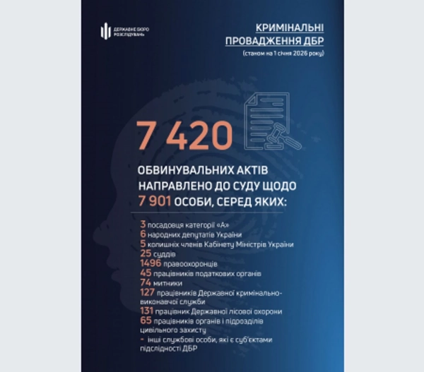 У 2025 році ДБР відправило до судової інстанції понад 7 тис. обвинувальних висновків стосовно 7,9 тис. осіб. З-поміж них 6 обранців народу, 5 екс-членів Уряду та 1,5 тис. представників правоохоронних органів.