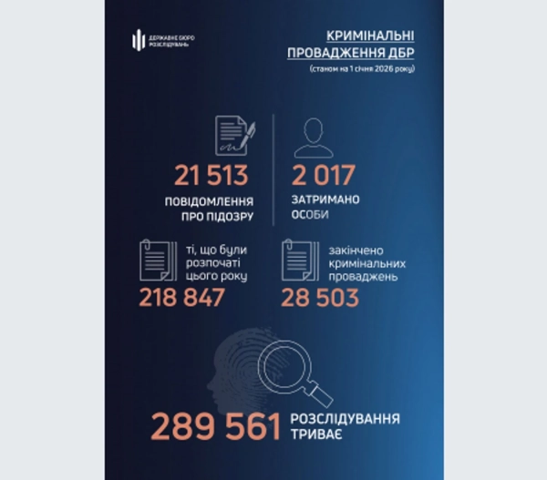 У 2025 році ДБР скерувало до судових органів більше 7 тис. обвинувальних актів щодо 7,9 тис. осіб, поінформувало про підозру 21,5 тис. фігурантів та здійснило затримання 2 тис. осіб. Про це інформує Державне бюро розслідувань, повідомляє УНН.