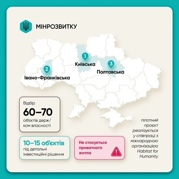 Слід зазначити, проєкт впроваджують на виконання Закону України №4080-IX, який передбачає додаткові інструменти забезпечення ВПО житлом. На початковому етапі запланований пілот у трьох областях: Київській, Івано-Франківській та Полтавській. Зараз відбувається відбір 60–70 об’єктів, з яких для підготовки докладних інвестиційних висновків мають відібрати 10–15 – там, де реконструкція є технічно та економічно виправданою.