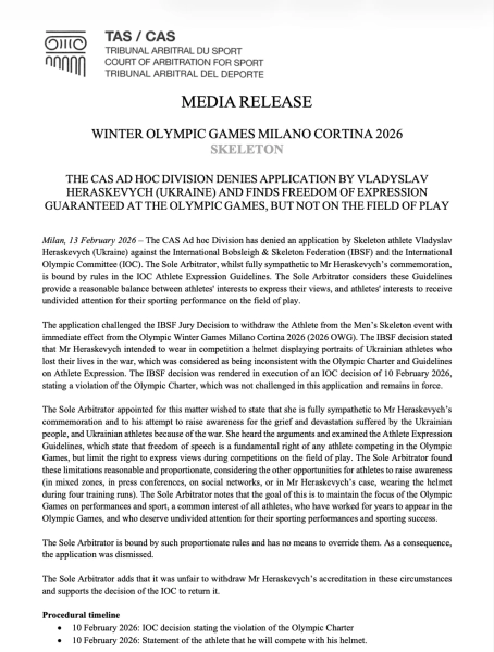 Спеціальна комісія CAS відхилила апеляцію скелетоніста Владислава Гераскевича проти Міжнародної федерації бобслею та скелетону і МОК. Суд підкреслив, що свобода висловлювання поглядів гарантується на Олімпійських іграх, проте не на арені.