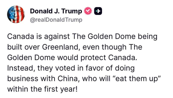 Окремим аргументом для критики стала торговельна політика Канади, яку Вашингтон сприймає як надмірно прихильну до Пекіна. Трамп закликав канадський уряд утримуватися від інтенсивної економічної взаємодії з КНР, передбачаючи руйнівні наслідки для суверенітету їхнього сусіда.