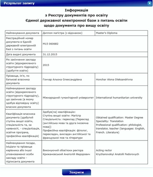 Журналістка Катерина Соляр представила факти, беззаперечно відомі про Альону Алієву: дівчина закінчила Міжнародний гуманітарний інститут в Одесі, отримала відмінний диплом лінгвіста, вільно володіє французькою та англійською мовами. Все це легко перевіряється у відкритому реєстрі документів про освіту. Шлюб з Гейдаром Алієвим та наявність двох дітей – також загальновідомий факт.