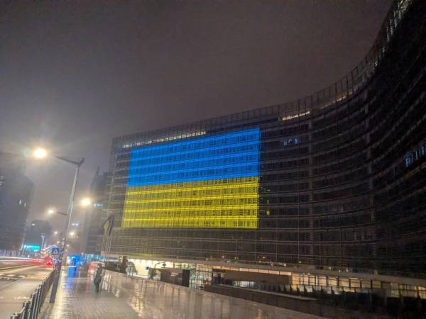 *Сьогодні ввечері ми оздоблюємо наші європейські інституції відтінками України. Два кольори, що передають дух відваги. Два кольори, що випромінюють опір”, – зазначила у мережі Х очільниця Єврокомісії Урсула фон дер Ляєн.
