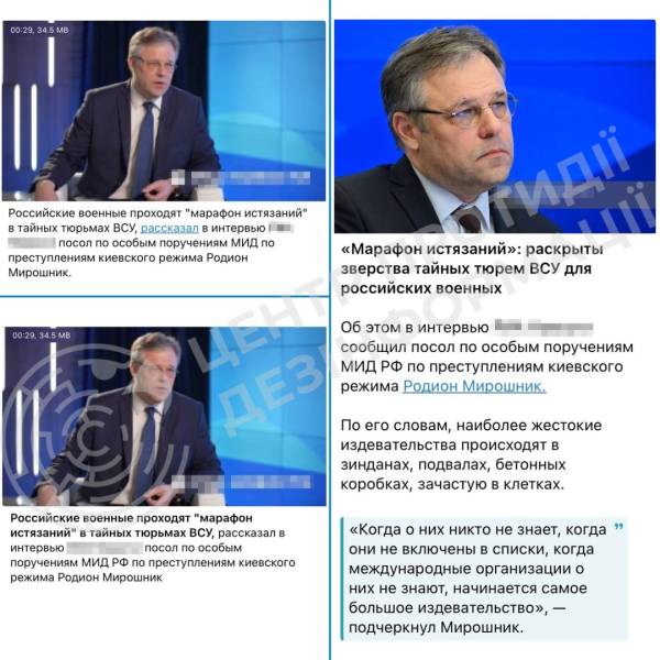 У розмовах з пропагандистами посол з особливих доручень Міністерства закордонних справ РФ щодо "злочинів київського режиму" Родіон Мірошник говорив про наявність "підземель" та "закритих в’язниць", де буцімто мучать російських військовополонених, використовують "електричні крісла" та організовують постановочні кадри.