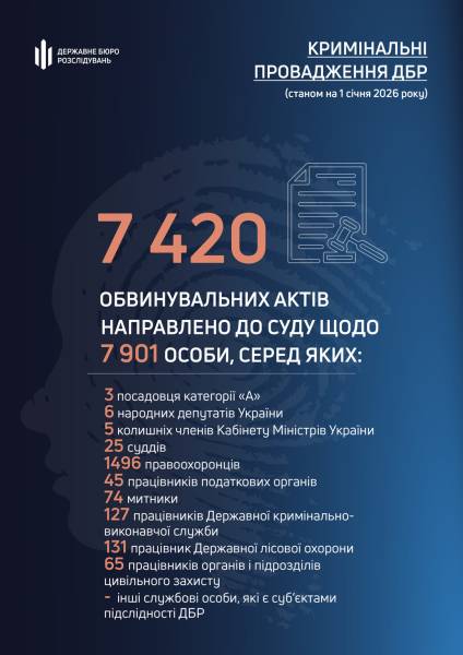 Протягом 2025 року за результатами розслідувань ДБР до суду було направлено 7 тис. 420 обвинувальних актів стосовно 7 тис. 901 особи.