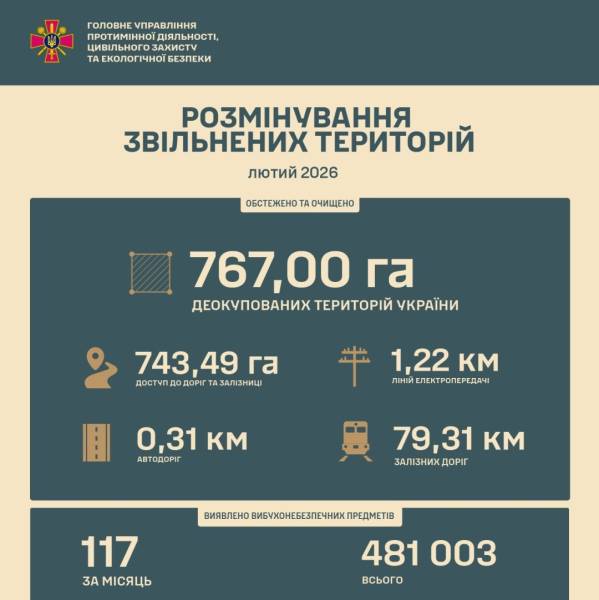 «Протягом лютого 2026 року підрозділи з розмінування Міноборони України знешкодили 767 га деокупованих територій, що були забруднені вибухонебезпечними залишками війни, спричиненими збройною агресією РФ», – зазначено у повідомленні.