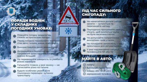 “У випадку інтенсивного снігопаду не намагайтеся проїхати снігові перемети – зупиніться та перечекайте негоду. Час від часу прогрівайте мотор, слідкуйте, щоб випускна труба не була засипана снігом. Не допускайте потрапляння вихлопних газів у салон. Не залишайте транспортний засіб – він є орієнтиром для рятувальників. Майте в автомобілі: лопату, ковдру або теплі речі, трос для буксирування, заряджений мобільний телефон”, – порадили в установі.