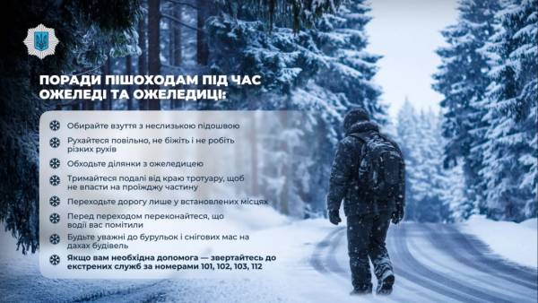 “Обов'язково використовуйте світловідбивні елементи на одязі. Також важливо не відволікатися на телефон під час руху слизькими зонами. Підбирайте взуття з підошвою, що не ковзає. Обминайте зони з ожеледицею. Тримайтеся на відстані від краю тротуару, щоб уникнути падіння на проїжджу частину”, – додали у МВС.