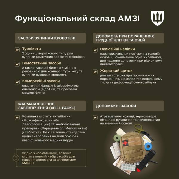 «Держава забезпечує кожного військового повним комплектом засобів для надання само- та взаємодопомоги. Аптечка медична загальновійськова індивідуальна (АМЗІ) є необхідним елементом екіпірування, що надається кожному захиснику», – відзначили у Міноборони.