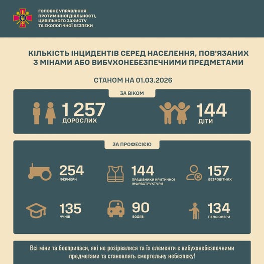 «Станом на 1 березня 2026 року внаслідок ворожих мін та вибухонебезпечних залишків війни зазнала поранень 1 401 людина, з них діти – 144, дорослі – 1 257», – йдеться у звідомленні.