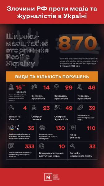 Зокрема, за період листопад – грудень ІМІ задокументував два злочини проти медіа та журналістів, здійснені Росією. Це випадки пошкодження офісів медіа та юридичний тиск на українських журналістів, яких утримує Росія. Так, в результаті російського обстрілу Запоріжжя в ніч на 26 листопада зазнало руйнувань приміщення філії «Суспільне Запоріжжя». Пошкоджено частину фасаду будівлі, розбиті вікна. Також російський суд виніс вирок у вигляді 14 років позбавлення волі громадянському журналісту Вілену Темер’янову з тимчасово окупованого Криму. Його було заарештовано у 2022 році вдома в Джанкойському районі Криму за сфабрикованим звинуваченням у тероризмі. Серед головних російських злодіянь проти журналістів та медіа: вбивства журналістів (121), зникнення безвісти (14), викрадення (29), обстріли (49), поранення (46), спроби вбивства (4), переслідування, погрози і залякування журналістів (130), захоплення та обстріл редакцій (39), обстріли телевізійних веж (23), відключення українського мовлення та впровадження на базі українських медіа російської пропаганди (35), кіберзлочини (110), закриття медіа, спричинене широкомасштабною російською агресією (333), блокування доступу до медіа в інтернеті (10), юридичний пресинг (33). Інститут масової інформації (ІМІ) – медійна громадська організація, що діє з 1996 року. ІМІ захищає права журналістів, проводить аналіз медіапростору та інформує про події, що стосуються медіа, протистоїть пропаганді та дезінформації, надає медіа засоби захисту для поїздок у зону бойових дій під час російсько-української війни з 2014 року. ІМІ проводить єдиний в Україні моніторинг свободи слова та перелік прозорих і відповідальних онлайн-медіа, фіксує медійні злочини Росії у війні проти України. ІМІ має представництва у 20 регіонах України та мережу хабів «Медіабаза» для безперебійної допомоги журналістам. Серед партнерів ІМІ – «Репортери без кордонів», також організація є частиною мережі Міжнародної організації із захисту свободи слова (IFEX). Як повідомляв Укрінформ, на передовій поліг режисер, журналіст, оператор Костянтин Штифурак (позивний «Режисер»). Загибель Журналіст Війна Медіа Війна з Росією