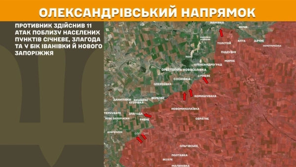 На Олександрівському напрямку противник учора здійснив 11 нападів поблизу населених пунктів Січневе, Злагода та в напрямку Іванівки й Нового Запоріжжя.