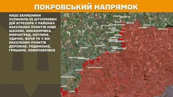 На Покровському напрямку українські захисники зупинили 25 штурмових дій агресора в районах населених пунктів Нове Шахове, Никанорівка, Мирноград, Котлине, Удачне, Філія та в напрямку населених пунктів Дорожнє, Родинське, Гришине, Новопавлівка.