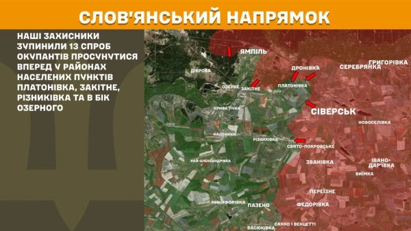 На Слов’янському напрямку протягом учорашньої доби українські захисники зупинили 13 спроб окупантів просунутися вперед у районах населених пунктів Платонівка, Закітне, Різниківка та в напрямку Озерного.