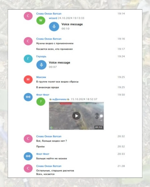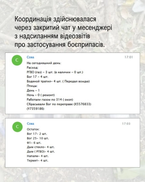 Координація відбувалася через закритий чат у додатку для обміну повідомленнями, куди відправлялися відеозвіти про застосування гранат.