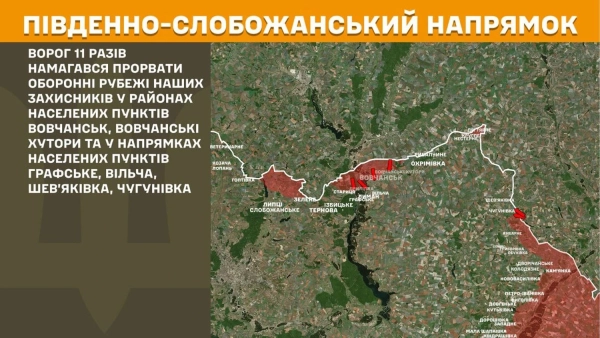 На Південно-Слобожанському напрямку ворог 11 разів намагався прорвати оборонні лінії українських захисників, в районах населених пунктів Вовчанськ, Вовчанські Хутори та у напрямках населених пунктів Графське, Вільча, Шев’яківка, Чугунівка.