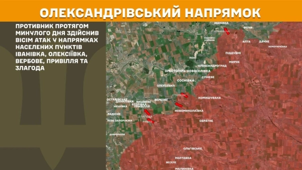 На Олександрівському напрямку противник протягом минулого дня здійснив вісім атак, у напрямках населених пунктів Іванівка, Олексіївка, Вербове, Привілля та Злагода.
