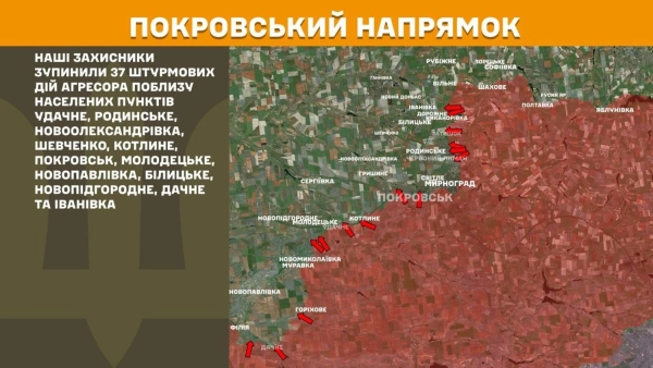 На Покровському напрямку українські захисники зупинили 37 штурмових дій агресора поблизу населених пунктів Удачне, Родинське, Новоолександрівка, Шевченко, Котлине, Покровськ, Молодецьке, Новопавлівка, Білицьке, Новопідгородне, Дачне та Іванівка.