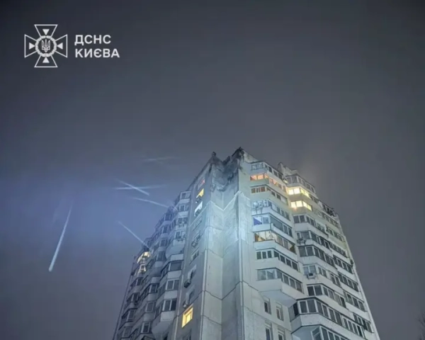 У Києві дрон противника атакував технічний ярус сімнадцятиповерхової споруди у Голосіївському секторі. Зіпсовано обличчя будівлі, шибки та шість машин, травмованих