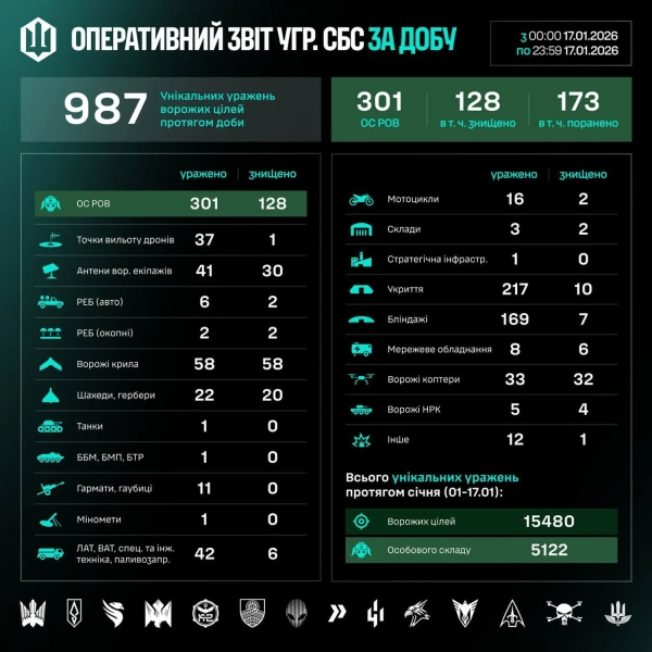 17 січня авіатори Сил безпілотних систем ЗСУ нейтралізували 301 російського загарбника та вразили 987 ворожих об’єктів. За січень ліквідовано 5122 загарбників та 15480 об’єктів.