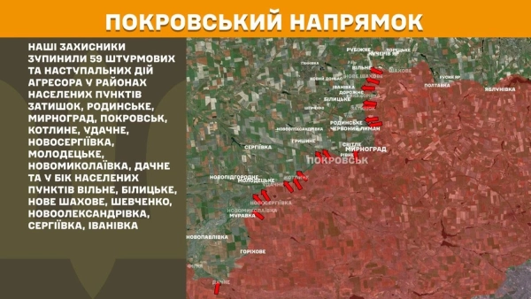 На Покровському напрямку наші оборонці зупинили 59 штурмових та наступальних дій агресора в районах населених пунктів Затишок, Родинське, Мирноград, Покровськ, Котлине, Удачне, Новосергіївка, Молодецьке, Новомиколаївка, Дачне та в напрямку населених пунктів Вільне, Білицьке, Нове Шахове, Шевченко, Новоолександрівка, Сергіївка, Іванівка.