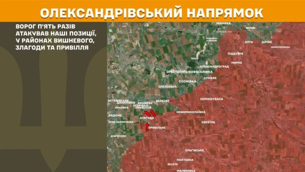 На Олександрівському напрямку ворог п’ять разів атакував наші позиції в районах Вишневого, Злагоди та Привілля.