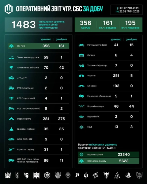 Від початку квітня (01–17.04) підрозділами СБС уражено 23340 об’єктів супротивника, з них 5623 – особовий склад