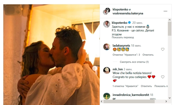 “Здається, у нас є звістки. P.S. Кохання – це промінь. Інформація – згодом”, – написав Клопотенко, додавши значок обручки.