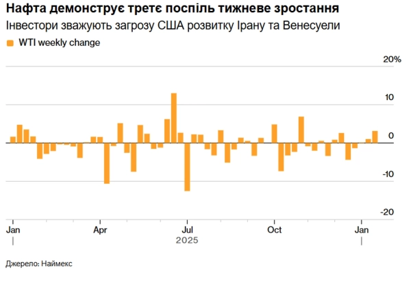 Ціни на нафту показують найдовше тижневе збільшення з літа минулого року. Основною причиною є розширення протестів в Ірані, де влада запровадила інтернет-блокування та посилила репресії. Ринок враховує ризики скинення режиму аятол, що може суттєво змінити геополітичну карту Близького Сходу та енергетичні шляхи.