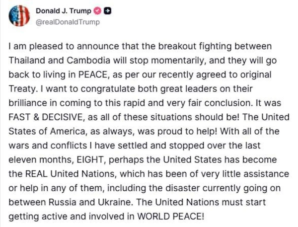 На цьому тлі президент США проголосив про тимчасове завершення військових дій між Таїландом і Камбоджею. Він сказав, що обидві сторони згодилися на мирне існування згідно з раніше підписаним договором.