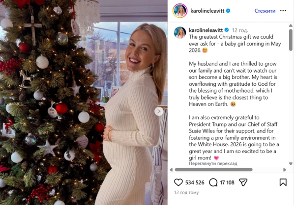 Найкращий різдвяний презент, про який тільки могли мріяти – маленька дівчинка, поява якої очікується у травні 2026 року. Ми з чоловіком радіємо збільшенню нашої сім’ї, і з нетерпінням чекаємо, коли наш син стане старшим братом. Моє серце сповнене вдячністю Всевишньому за дар материнства, який я по-справжньому вважаю найближчим до Раю на Землі. Я також безмежно вдячна президенту Трампу та нашій керівниці апарату Сьюзі Вайлз за їхню прихильність та за сприяння створенню сприятливої для сім’ї обстановки в адміністрації. 2026 рік обіцяє бути чудовим, і я безмежно щаслива бути мамою дівчинки!