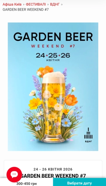 24–26 квітня – Garden Beer Weekend #7 – Київ У культурній зоні ВДНГ (Київ) Garden Beer Weekend #7 відкриється 24–26 квітня 2026 року для шанувальників крафтового пива, вуличної їжі та музики на свіжому повітрі. Дійство навіть було включено в анонси квиткових сервісів як одна з найважливіших фестивальних подій весни.