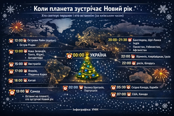 Святкування Нового року по всій планеті Земля займає майже двадцять чотири години. Першими новорічну ніч зустрічають мешканці островів Лайн в Тихому океані, а завершують святкування жителі Самоа. Редакція УНН підготувала для вас інформацію про те, коли різні країни світу зустрінуть прихід 2026 року.